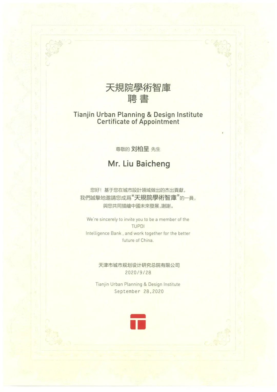 隨后,天津市城市設計規(guī)劃研究院黨委書記李洪剛為劉柏呈董事長頒發(fā)“天規(guī)院學術智庫”聘書,雙方將共同探索深度合作的專家智力支持機制,劉柏呈董事長也將為描繪天津城市發(fā)展的藍圖建言獻策,貢獻力量。
