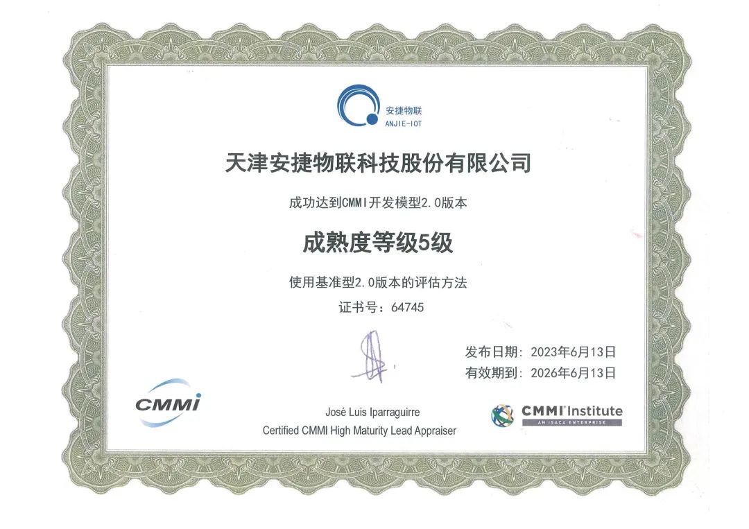 近日,安捷物聯順利通過全球軟件領域難度最大、規(guī)格最高的軟件開發(fā)能力成熟度認證CMMI 5,并獲CMMI研究院ISACA頒發(fā)的CMMI 5 V2.0認證證書。